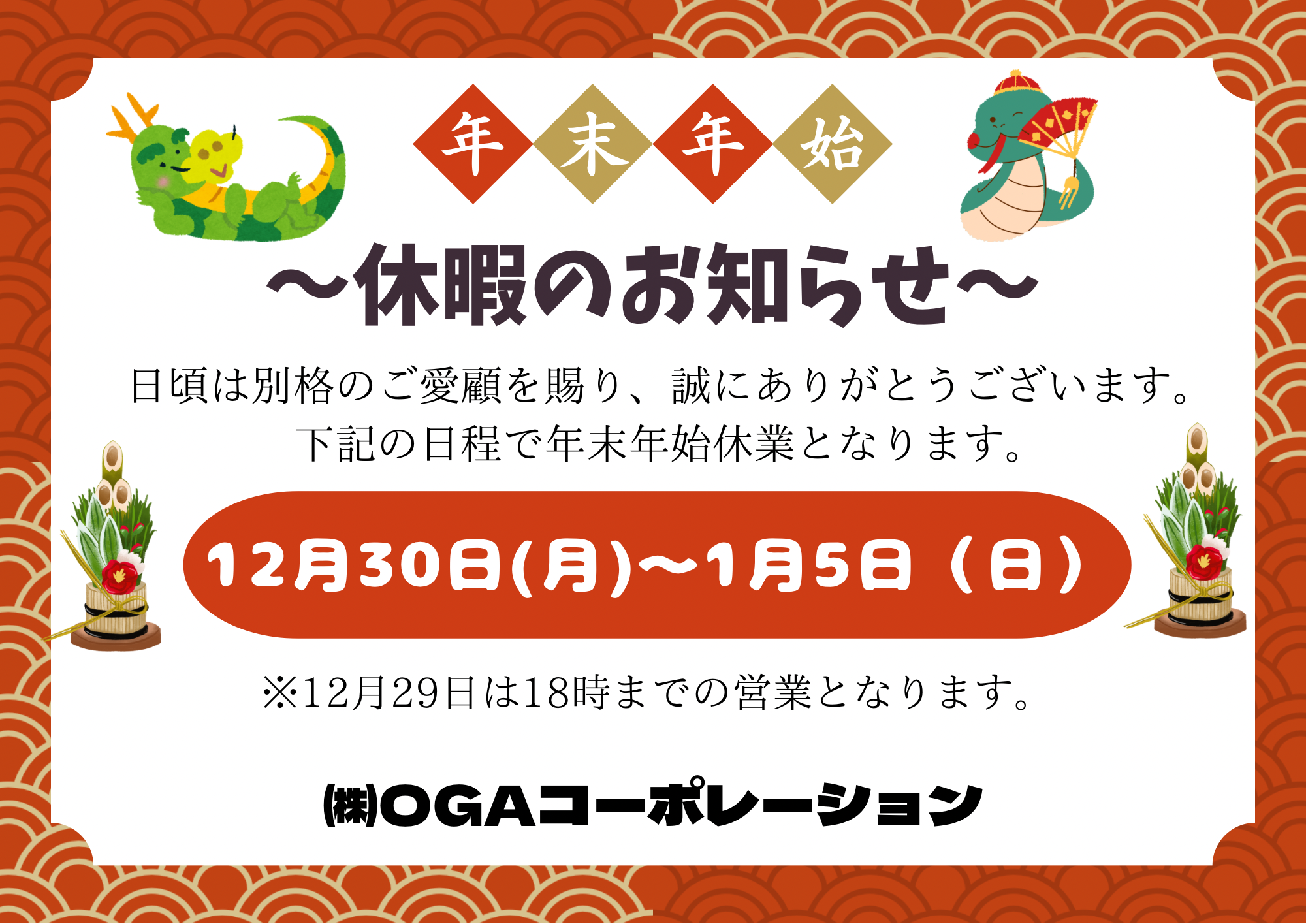 年末年始休業のお知らせ