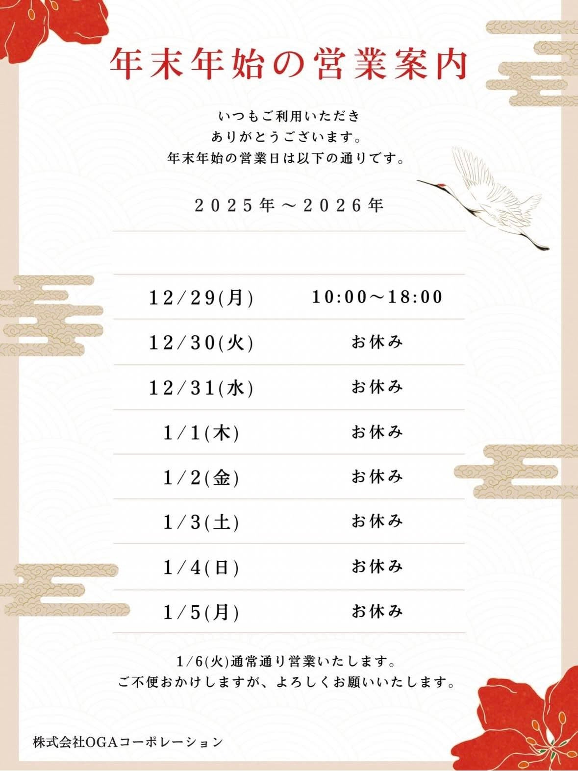 休業日 【12月30日(火)~1月5日(月)】